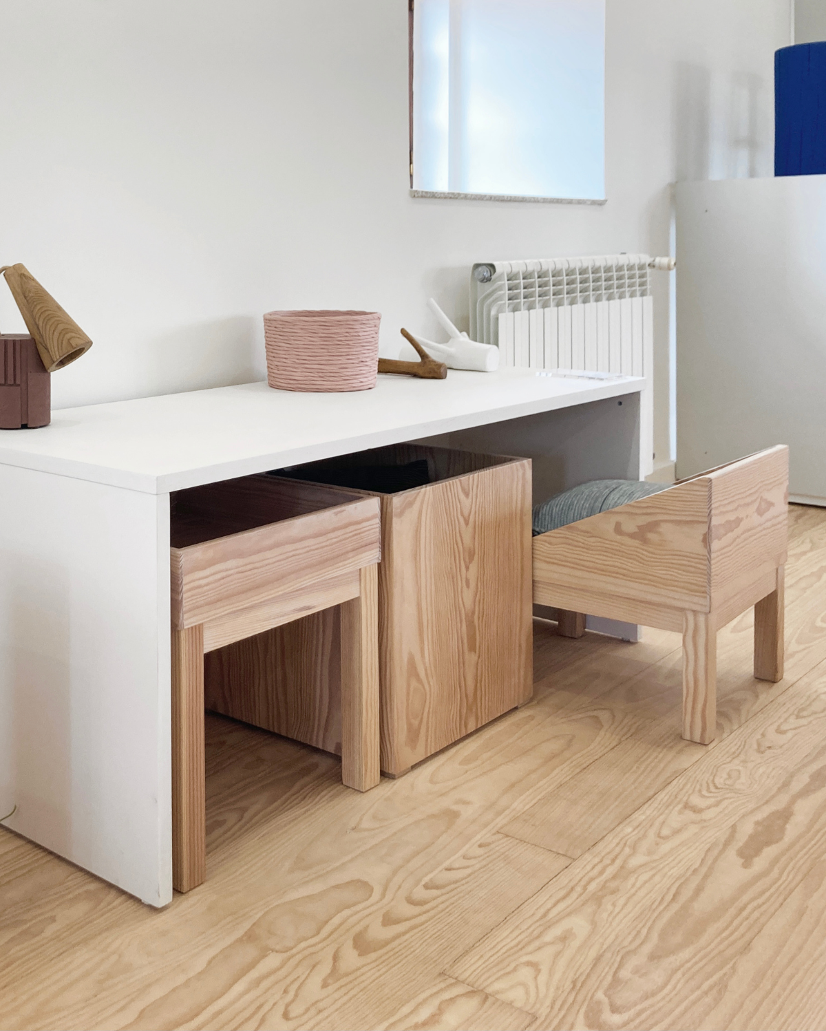 The Benjamin line for children was based on pedagogical principles regarding children’s autonomy since infancy. The cradle and the bed allow the child to safely get on and off, after a certain age. The bench stimulates the child to play, draw and paint. Underneath it wooden boxes with toys, pencils and paper can be stored, as well as a little chair. These boxes are beautiful and portable and can be taken to the living room or the office, so that children can play next to (or with) their parents. Children’s furniture doesn’t have to be full of vibrant colours or figurative shapes. Books, toys and drawings play that role. Children’s furniture should be easy to understand and use and it should provide the tactile sensations of natural materials.