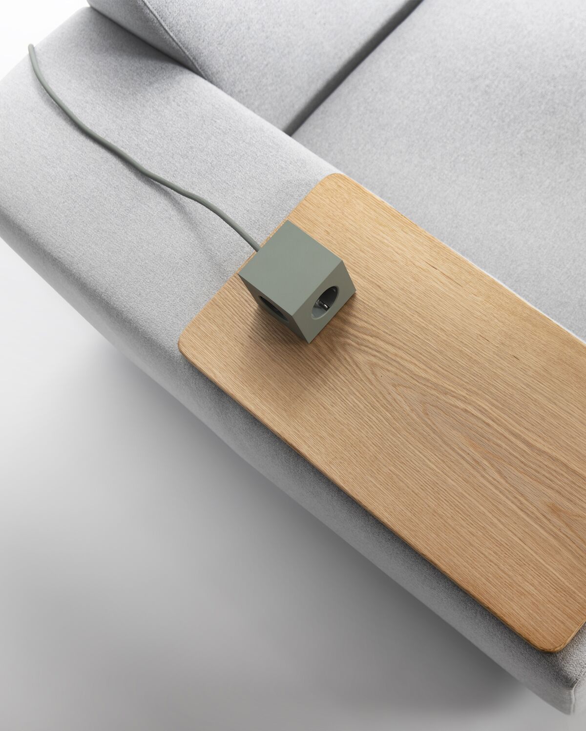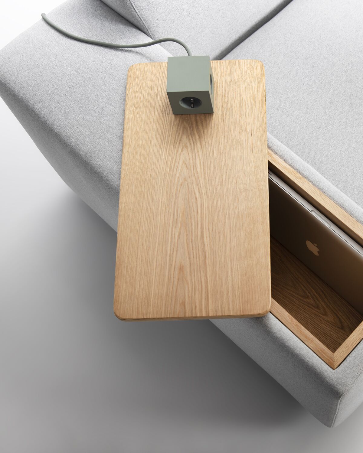 Storage space inside the arm of the sofa, for the power extender, tablet, laptop, TV remote control…