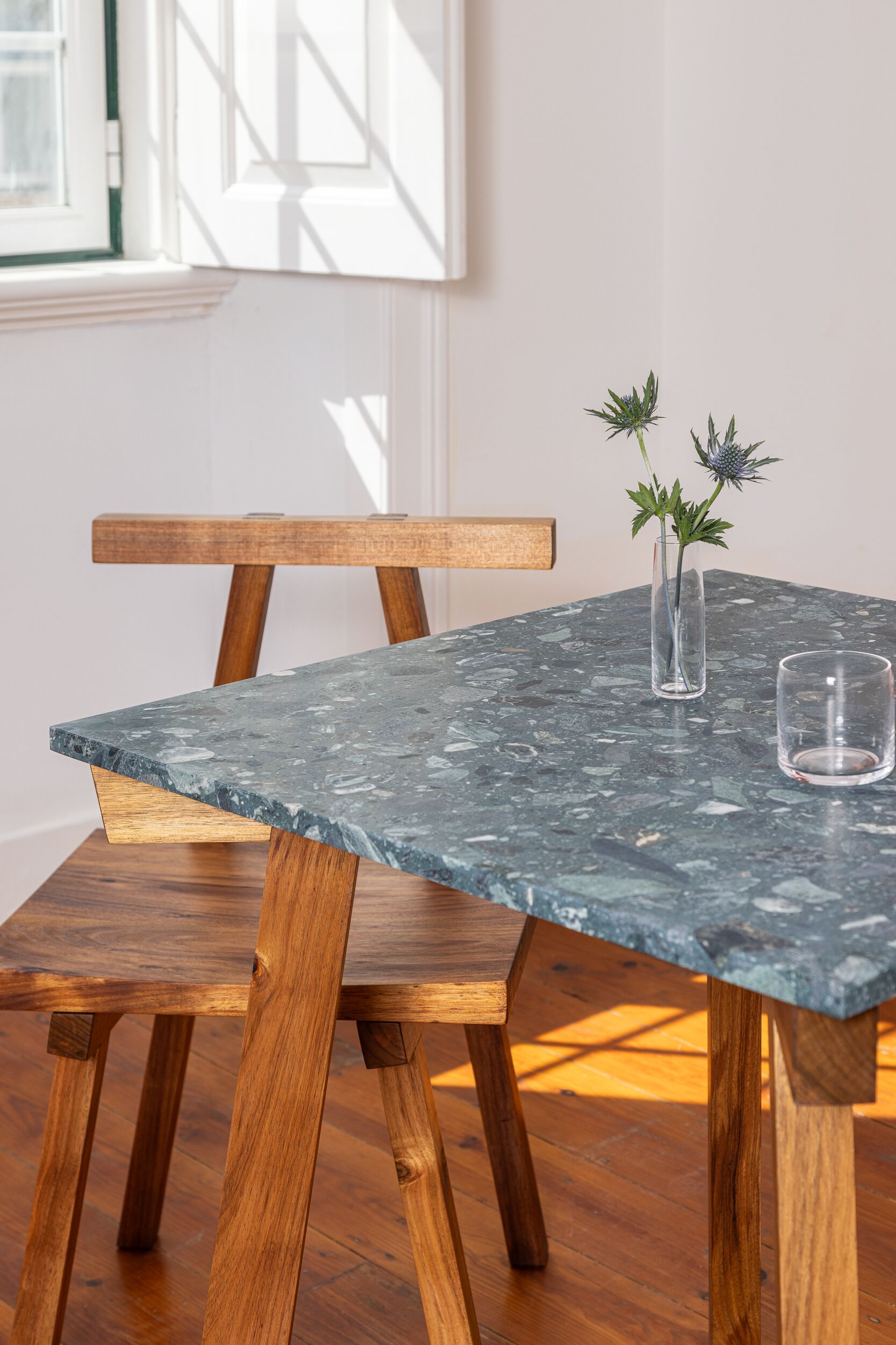Terra Table reminds a type of table that has always existed in Portugal. Stone top, sturdy base, no ambition beyond being useful. You find them in old tabernas, in farmhouse kitchens, in rooms where generations sat without ever thinking about design. Never fashionable because never trying to be. They just lasted.